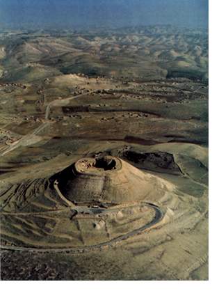 Herodium is a man-made mountain located in the middle of the desert region of the Judean wilderness, 8 miles south of Jerusalem and 3 miles east of Bethlehem. Herod, Palestine's greatest builder, created the seven-story palace atop a natural hill and then constructed a sloping fill of earth and gravel around it, partially burying his palace to create a virtually impenetrable wall of defense. Originally, the seven story monolith rose 90 feet above the ground, but the top three layers have since been destroyed.