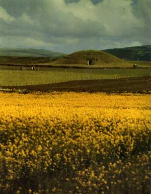 Maes Howe is a large burial mound containing the finest chambered tomb in Northwestern Europe. Built approximately 5000 years ago, it stands as symbol of the impressive architectural achievement of the early farming communities. Maes Howe functioned as a burial ground for generation upon generation of agrarians. Scientists and archeologists have examined the objects unearthed in the tomb and by comparing these artifacts with other Neolithic finds have estimated that initial construction began in 3000 BC. The structure of the Maes Howe tomb reveals that its builders had a knowledge of the seasonal movements of the sun. For instance, windows in the main chamber are positioned to receive direct sunlight during the winter solstice -- an important date for early agrarians.